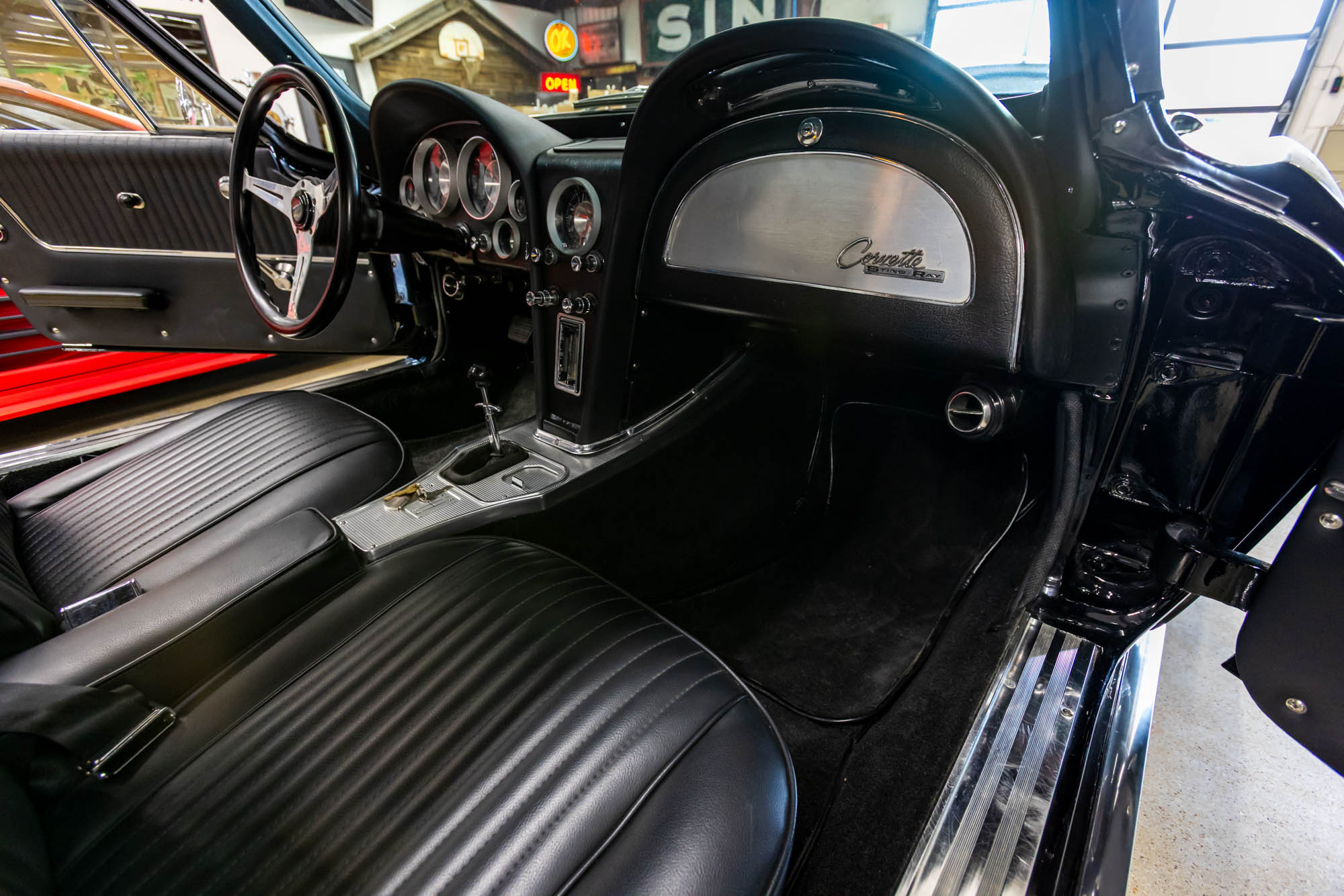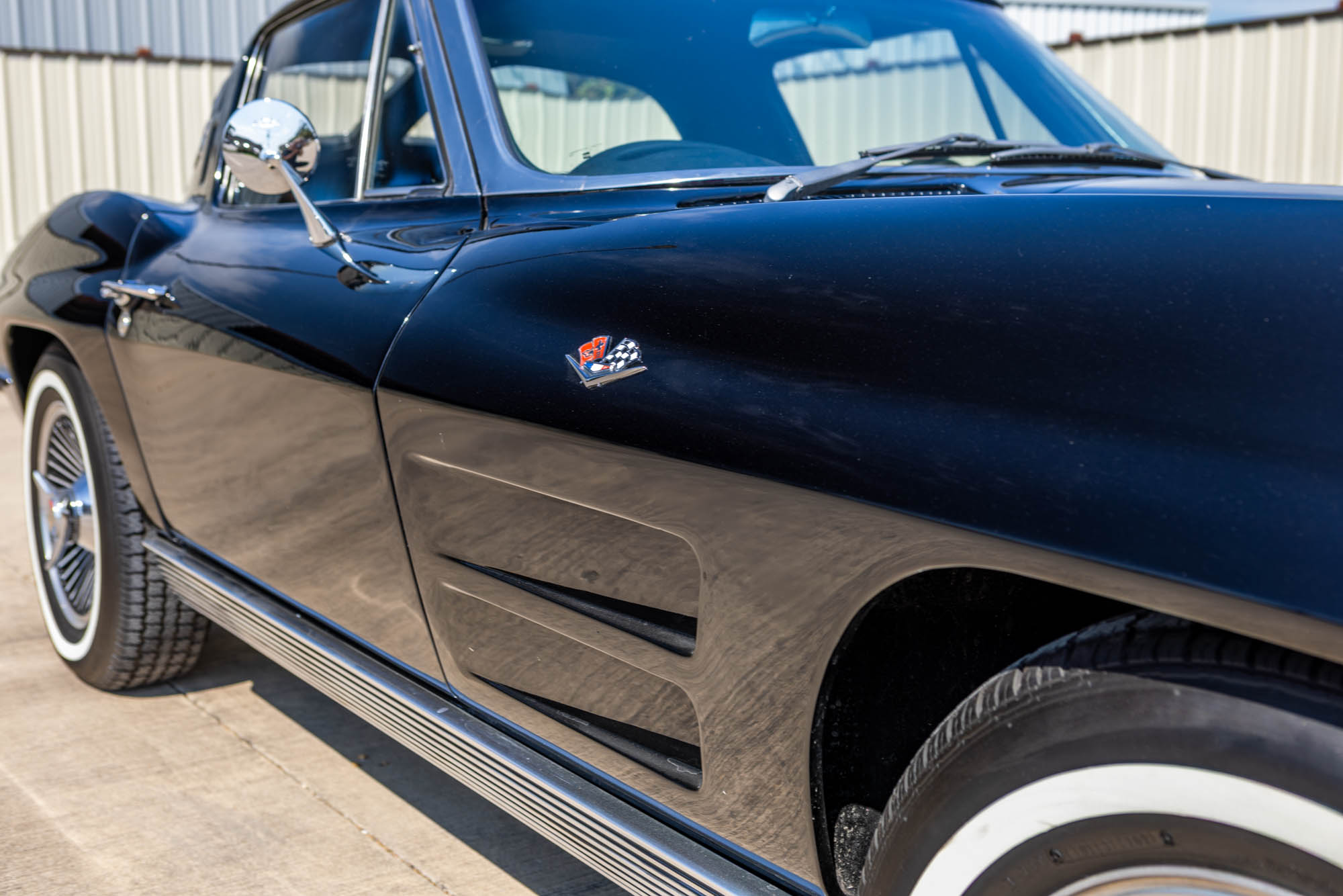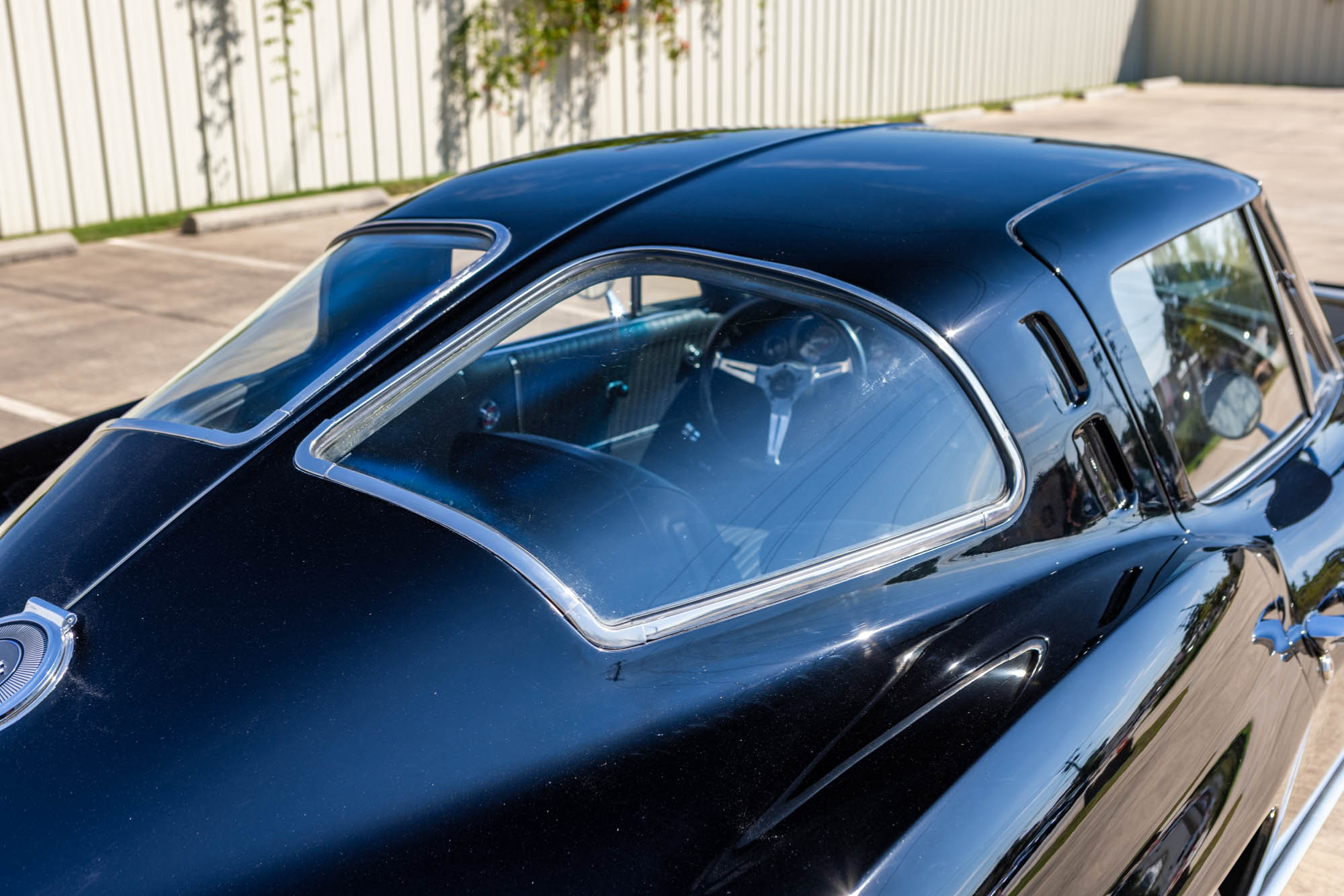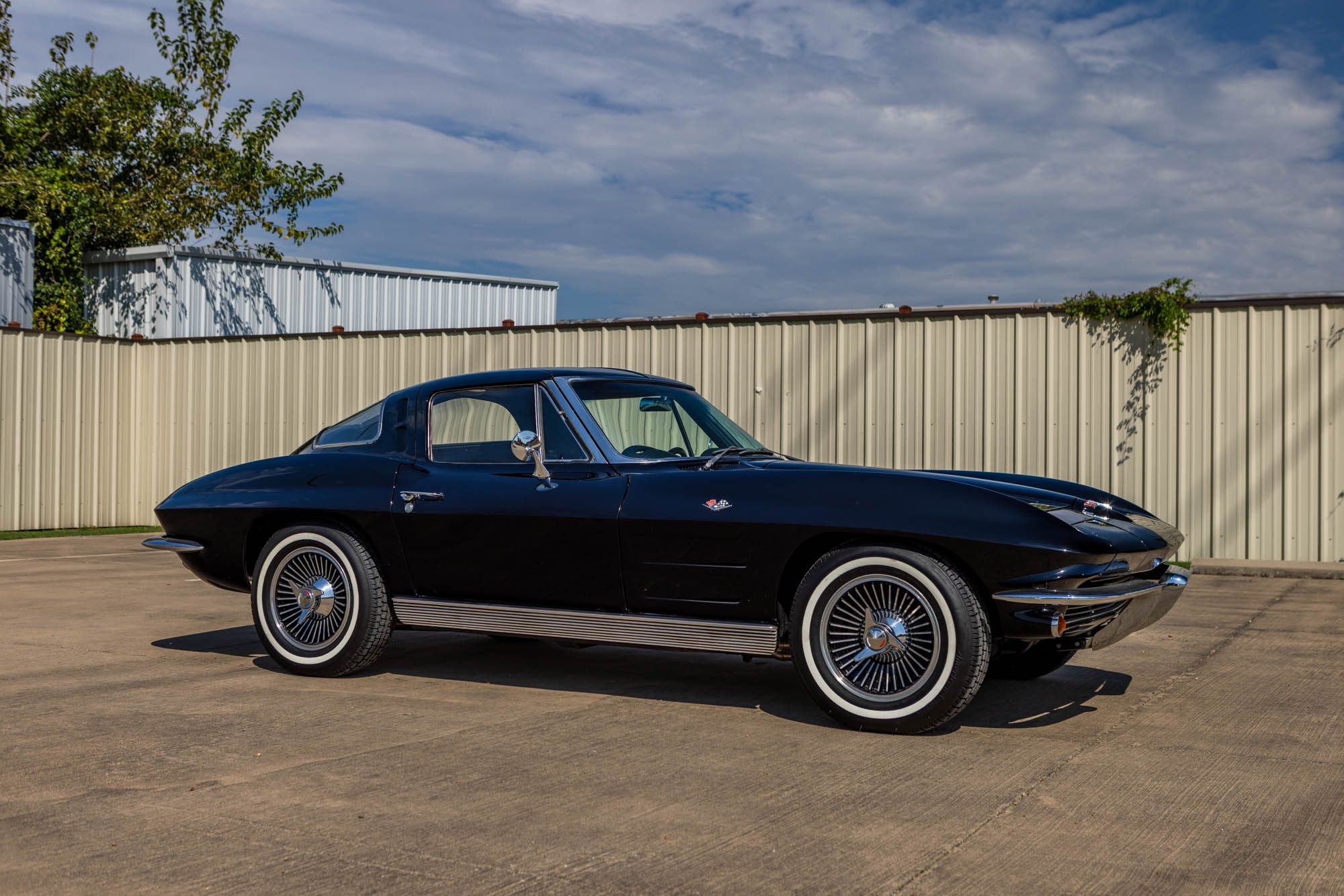 The 1963 Corvette Stingray Split-Window Coupe, a highly collectible model, stands out with its unique split rear window—a design feature exclusive to that year's coupe version. This particular vehicle, finished in Daytona Blue with an upgraded black vinyl interior, is powered by a 327 cu in (5.4 L) small-block V8 engine paired with a 4-speed manual transmission. It also boasts advanced engineering for its time, including a new ladder-type frame, four-wheel independent suspension, self-adjusting disc brakes, and updated steering geometry.