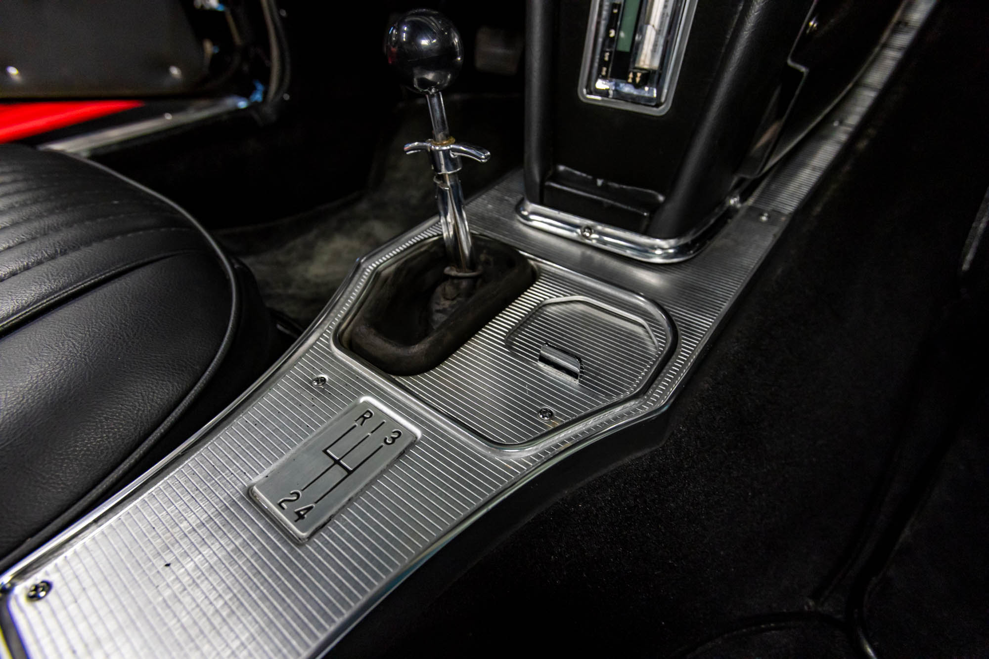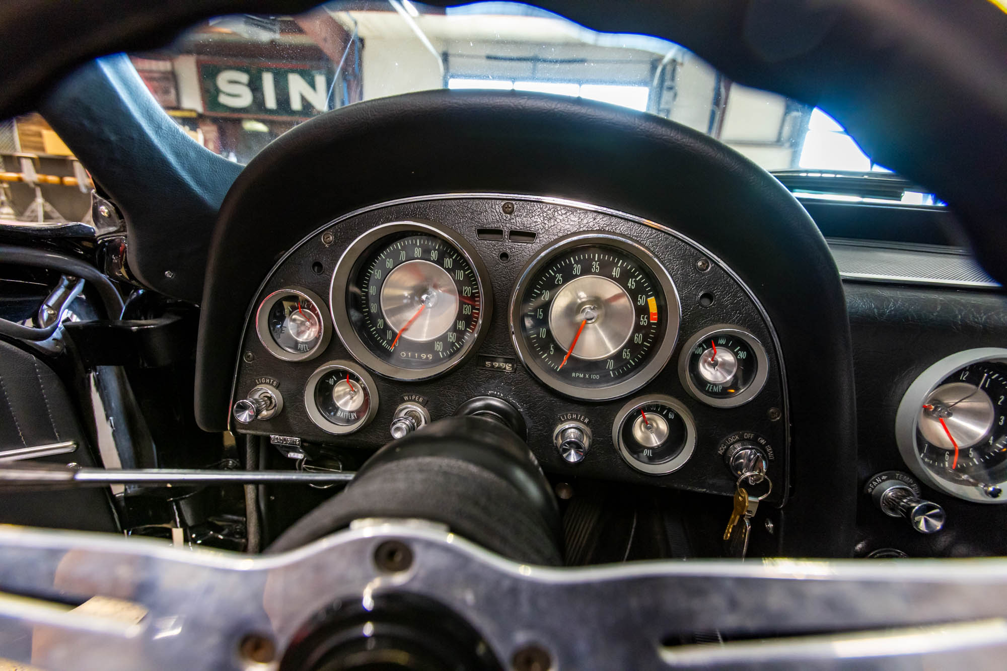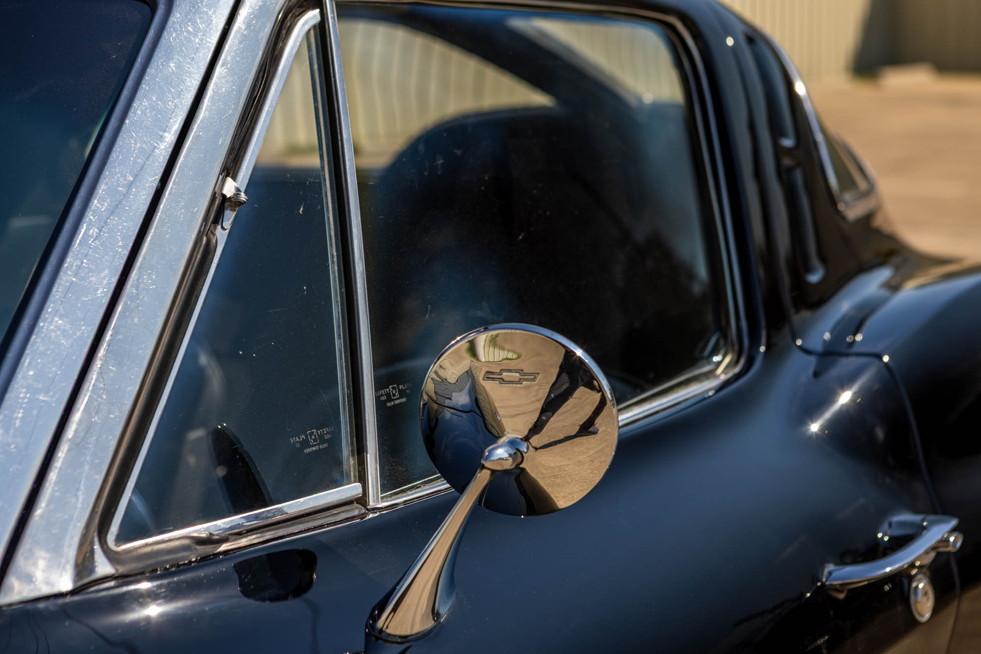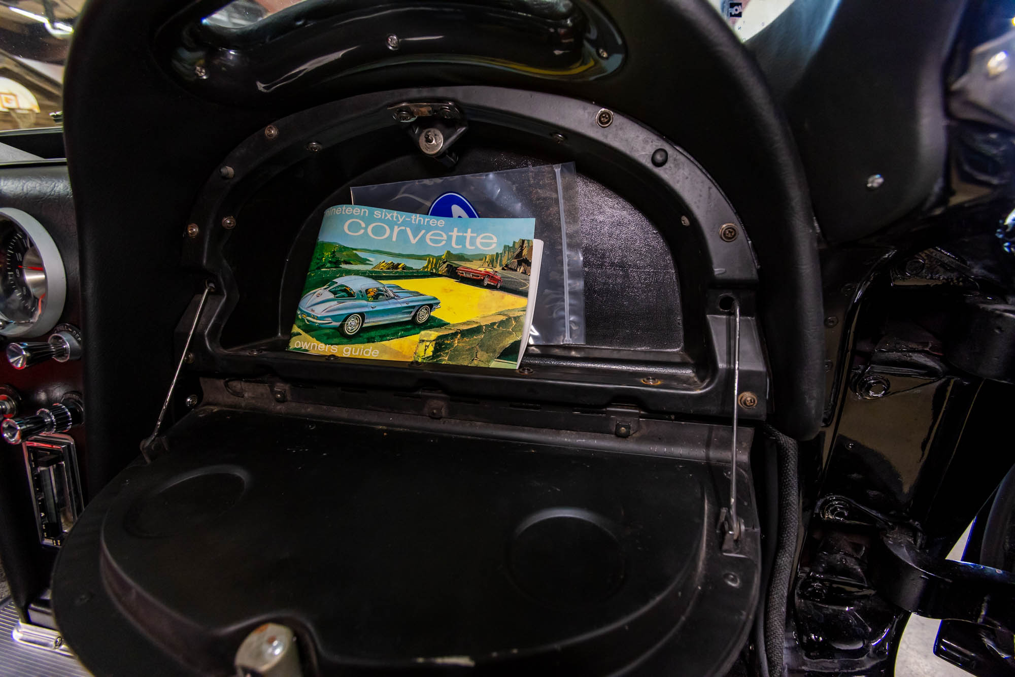 The 1963 Corvette Stingray Split-Window Coupe, a highly collectible model, stands out with its unique split rear window—a design feature exclusive to that year's coupe version. This particular vehicle, finished in Daytona Blue with an upgraded black vinyl interior, is powered by a 327 cu in (5.4 L) small-block V8 engine paired with a 4-speed manual transmission. It also boasts advanced engineering for its time, including a new ladder-type frame, four-wheel independent suspension, self-adjusting disc brakes, and updated steering geometry.