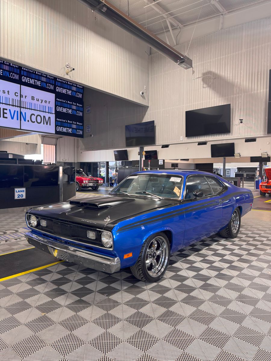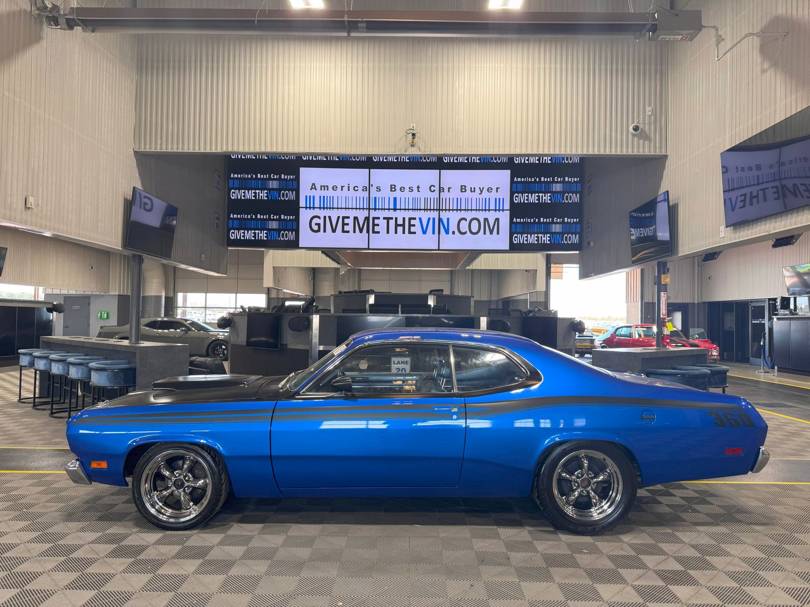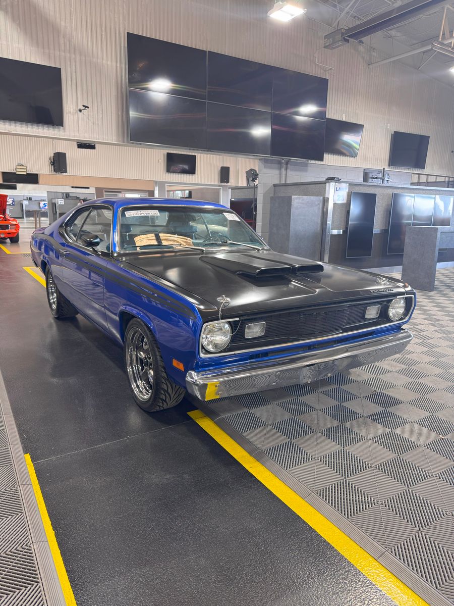 This 1970 Plymouth Duster is powered by a 360 cubic inch V8 with a 4-speed manual transmission. This was a nut-and-bolt restoration, with the chassis and suspension all powder-coated and refinished. The engine is stock in appearance, with MSD ignition, headers, Mopar valve covers, and an aftermarket aluminum intake. The interior is done in stock fashion with a pistol grip shifter, factory gauges, and a bench seat. The exterior was restored recently with the correct B5 blue finish and 360 vinyl Billboard decals, and a flat black snorkel hood. The suspension has been lowered 3" and is sitting on chrome American Torq wheels with performance tires.